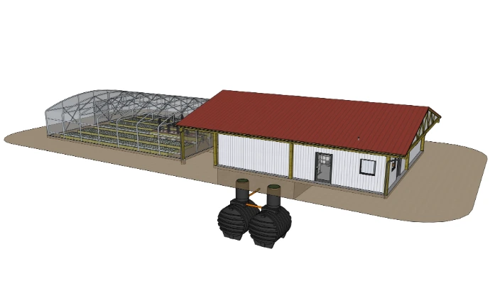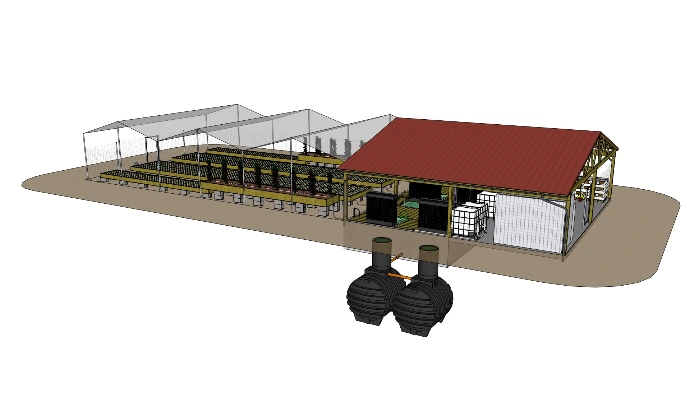 The filter system, the growout and the juvenile tanks are made of wood with with inserted liner bags. The coupling tank is an underground tank.