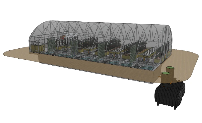 The greenhouse is typically made of a steel structure with isolated foil. As an alternative glass greenhouse can be used.