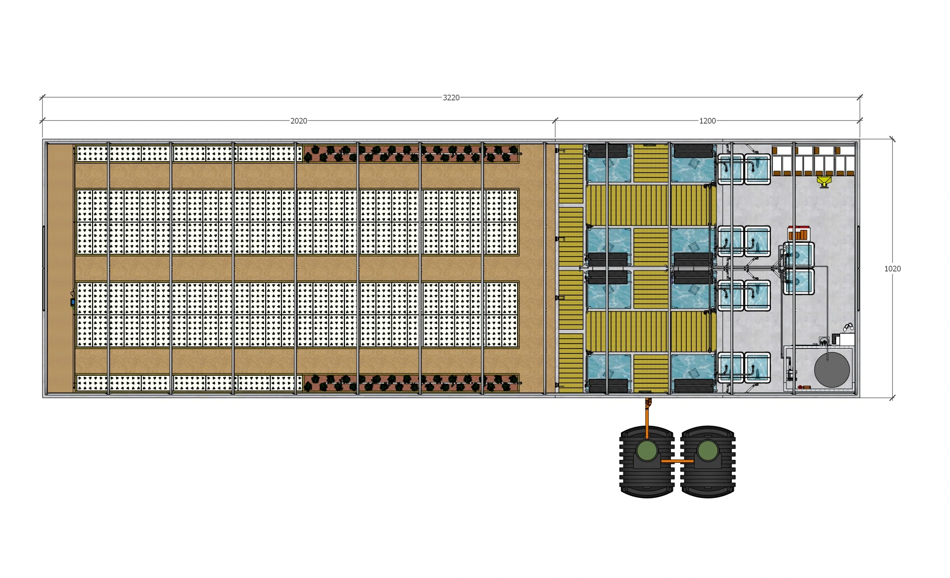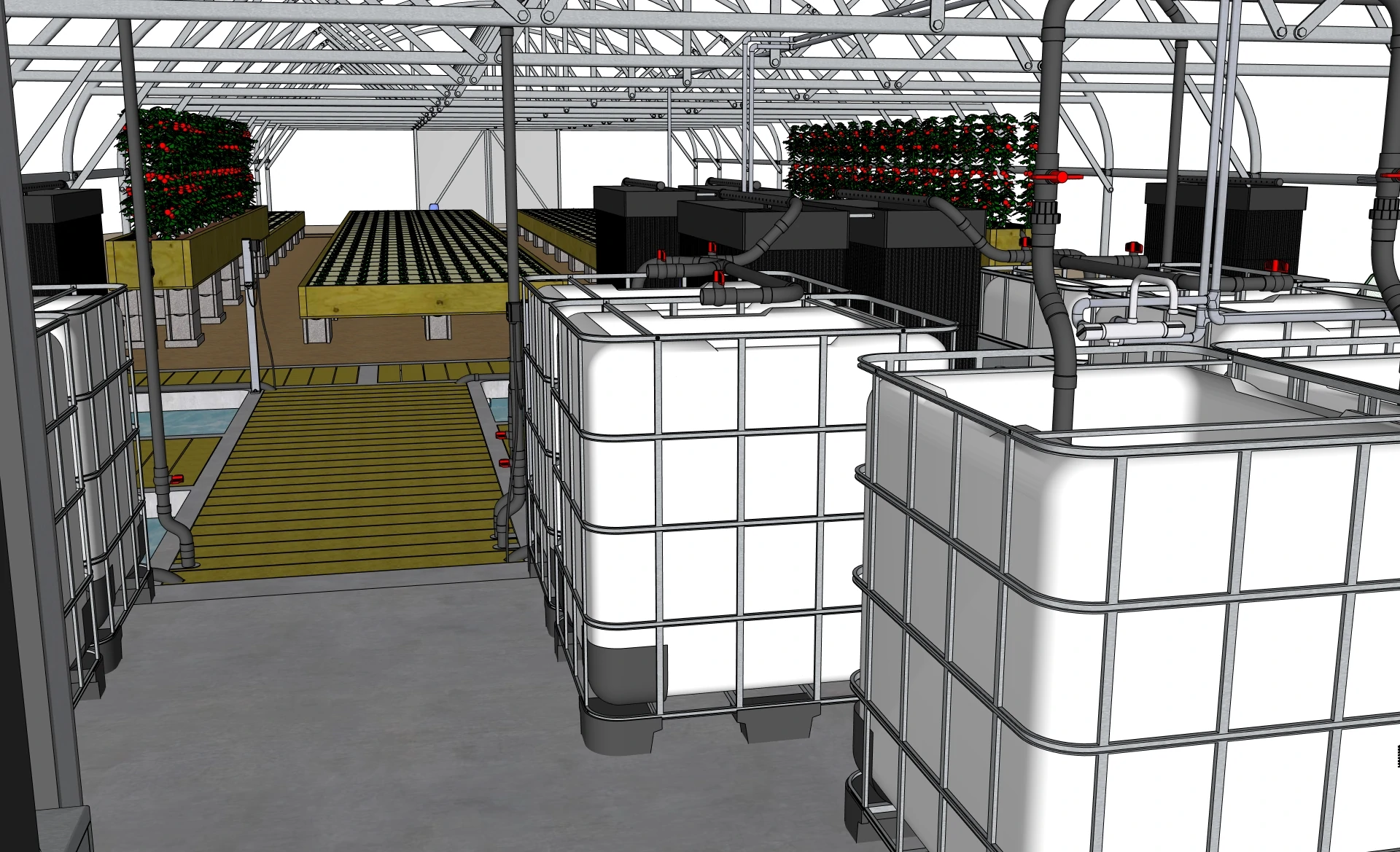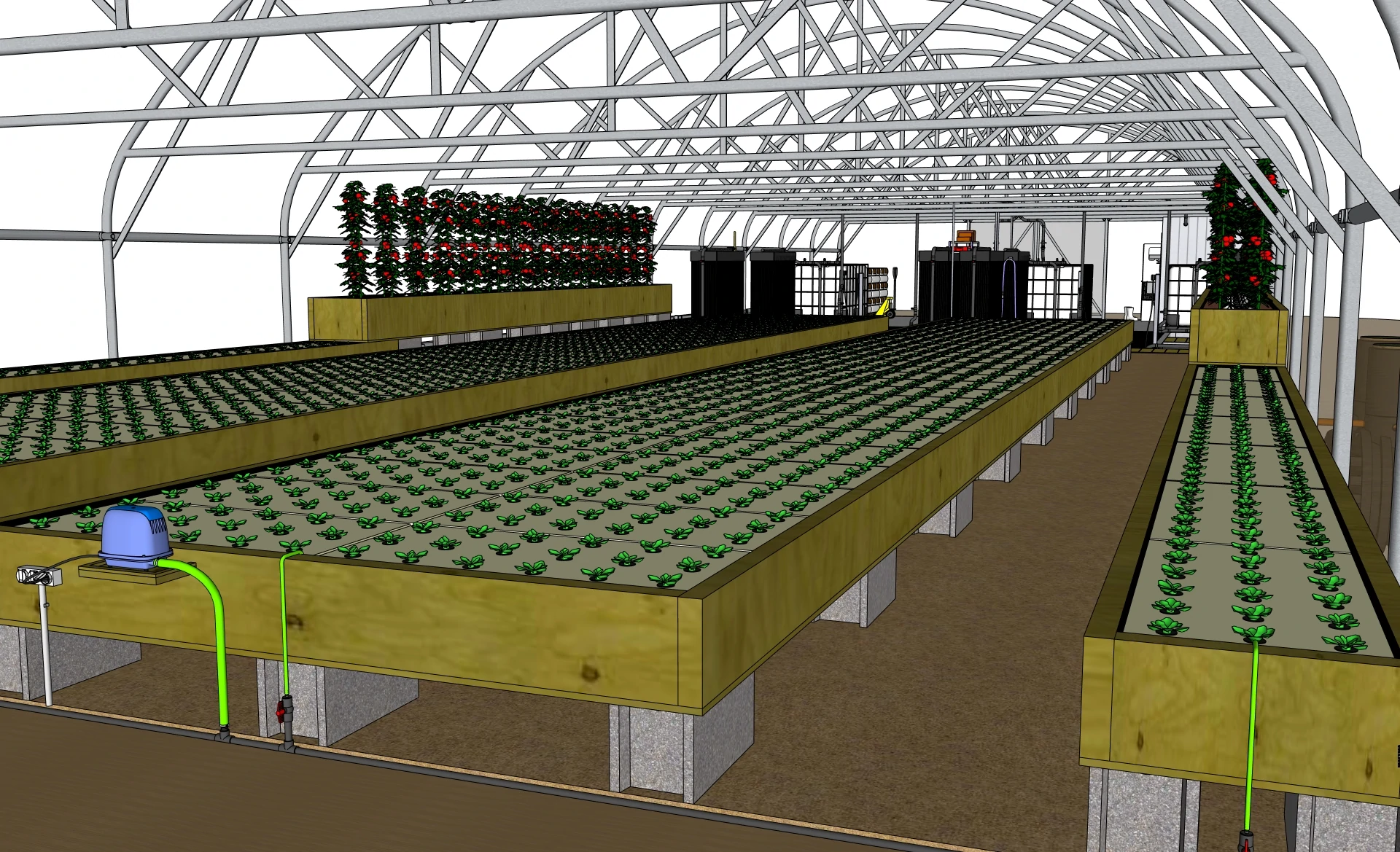 The aquaculture section consists of two separate circuits housed in concrete tanks. Each circuit consists of 4 grow-out tanks, 4 juvenile tanks, two solids filters, and one bio filter. Via the coupling tanks, the water is directed into the hydroponic section, where it flows through the plant beds and finally back into the coupling tanks.